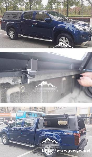 江西五十铃dmax皮卡车三开门后箱高盖改装件,全金属材质,遮阳挡雨,结实耐用。全冲压装饰板,冲压云纹设计,一侧带脚蹬,可登盖顶。带有液压升降窗盖,开合灵敏。免打孔安装,卡扣固定,方便快捷,三侧带锁,安全放心。