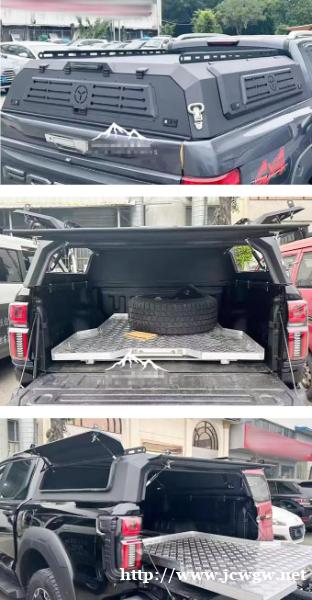 长城炮山海炮加长炮皮卡车半高盖后箱货箱盖,锰钢材质,整体打磨,结实耐用。原车数据开模,半高设计,带高位刹车灯,提高行车安全。采用液压升降窗盖,快速开合。带锁设计,安全可靠。免打孔安装,方便快捷。