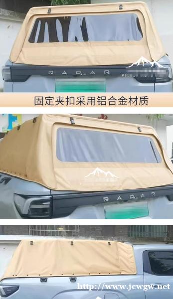雷达RD5/6金刚地平线新能源皮卡车软高盖牛津布高蓬布料后盖,牛津布复合布材质制成,耐压折,防水防雨。骨架底板是加厚碳钢材质,蓬顶支架是不锈钢材质。固定夹扣采用铝合金材质,坚固。软高盖不用时,可折叠。带有魔术贴,拉链进行密闭加固,拆装方便。